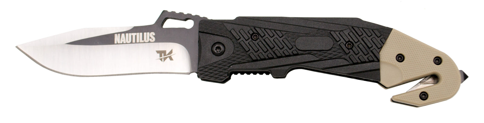 Tramuntana Tactical Pocket Knife model NAUTILUS N79B with 420 steel blade, black finish and satin finish, 9.2 cm, nylon fiber handle with brown G10, with glass breaker and double-blade belt cutter, with presentation box, with clip. Imported item. Ref. N79B