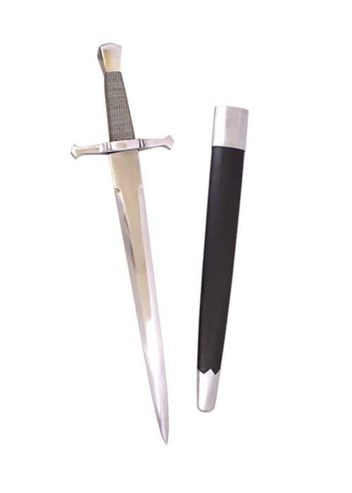 Esta daga decorativa tiene una hoja de acero al carbono forjada a mano. Tiene un mango de madera envuelto en alambre de metal.