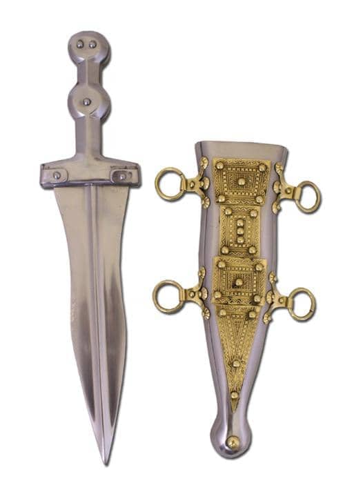Réplica de una daga romana siglo 1. El Pugio tiene una funda decorativa hecha de acero, que está ricamente decorado con accesorios de latón.