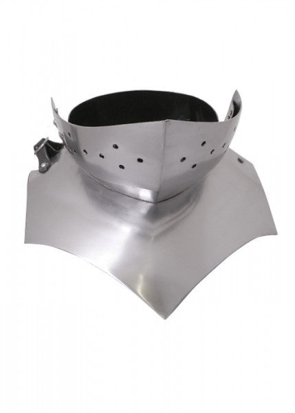 Hecho de acero de 1,6 mm de espesor. El Halsberge incluye la placa trasera, que se fija en un lado por medio de un cinturón con hebillas de tamaño ajustable. El protector de barbilla de tres piezas es ajustable.