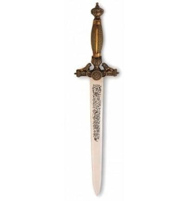 Puñal de león grabado acabado en plata envejecida, en latón o en acabado rústico, con hoja en acero inoxidable. Longitud 49 cms, peso 650 gramos Está hecho en Toledo por lo que es primera calidad.