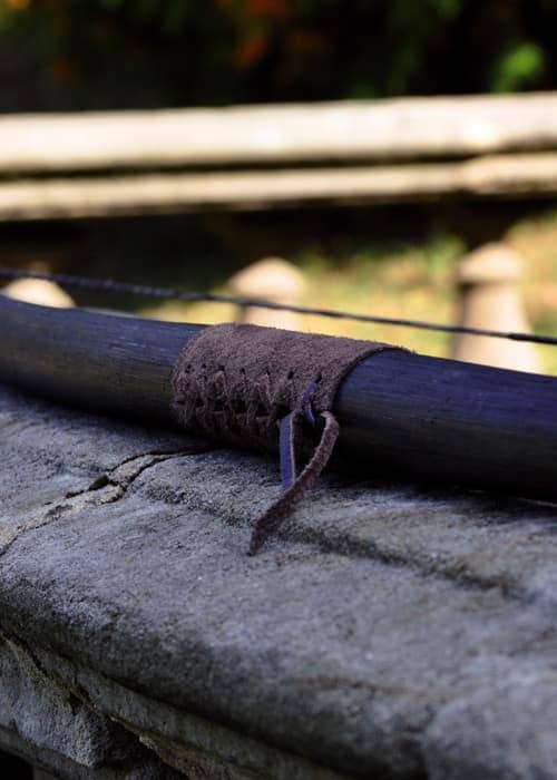 Arco largo "Agincourt" LARP 50 " Un arco largo hecho de madera de palma de ratán, que es muy resistente, potente y extremadamente duradero. Un arco de madera se ve más auténtico y simplemente se ve mejor que un arco de fibra de vidrio. El arco LARP está hecho sin estante , para que los diestros y zurdos puedan usarlo. Está teñido de negro y tiene un mango de cuero negro. El peso de tracción está limitado a 25 lbs, por lo que se pueden evitar lesiones con el uso de las flechas LARP correspondientes y la aprobación de los organizadores no será un problema.