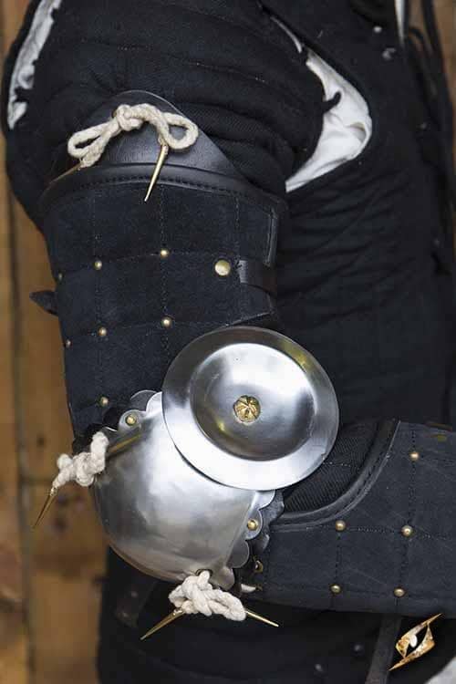Los brazaletes de férula verde de Epic Armory son un par de protectores de codo y brazo de cuero y metal. La codera de acero de 1 mm de espesor está forjada y tiene forma para proporcionar la mayor protección a todo el codo, incluidos los lados gracias a una placa de ventilador adjunta. Los protectores de los brazos están hechos de cuero grueso de primera calidad y una fila de tiras de metal unidas al interior. Con estas tres partes superpuestas que proporcionan comodidad y flexibilidad, tienen una gran movilidad en el campo de batalla.