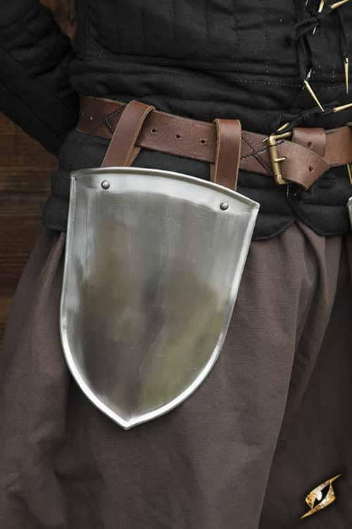 Epic Armory's Scout's Belt Shield son dos placas diseñadas para proteger los muslos. Estas placas de acero con borde enrollado cuelgan de su propio cinturón para cubrir los muslos exteriores, deslizándose en su lugar con asas de cuero marrón firmemente sujetas con remaches. Cada plato mide 25 cm de largo y 21 cm de ancho, con dos bucles de cuero doblados de 24 cm.