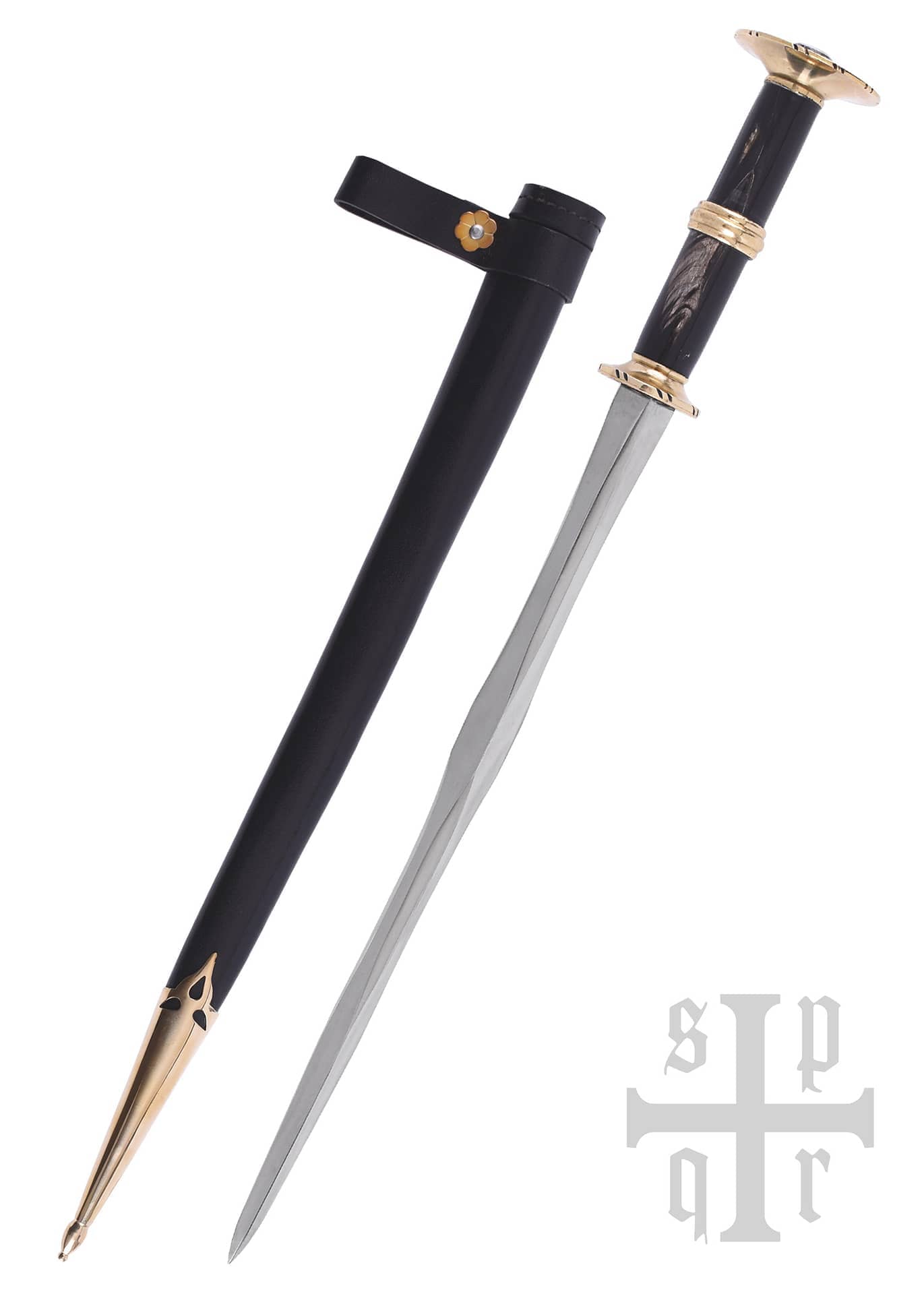 Esta hermosa reproducción presenta una hoja de acero grueso con sección transversal cuadrada, bordes redondeados (en algunos lugares cóncavos) y una punta puntiaguda. La protección y el pomo en forma de plato o disco, históricamente precisos, así como el anillo central del mango, están hechos de latón. La empuñadura en sí está hecha de cuerno. Como el cuerno es un producto natural, ¡cada daga tiene su propio mango único! Las variaciones en el color y el grano del cuerno son bastante comunes y, por lo tanto, las imágenes de arriba son sólo para referencia.