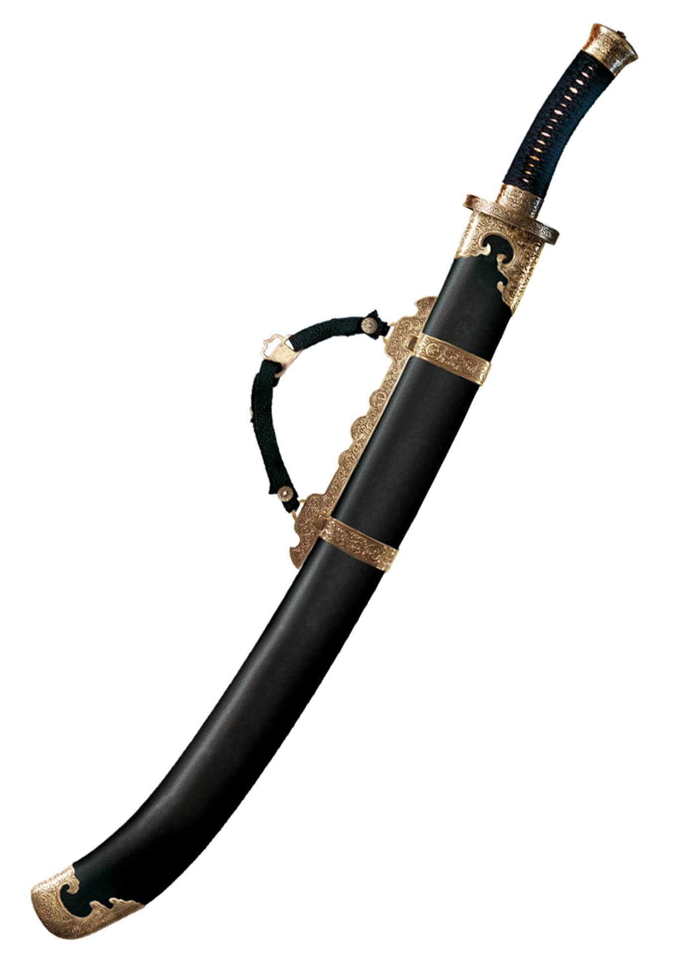 El mango largo de la espada está envuelto en cordón con guardamanos tradicional y pomo de latón, lo que proporciona una sensación cómoda y segura al sostener la espada. La espada también viene con una funda de cuero resistente para garantizar su seguridad y protección durante el transporte.