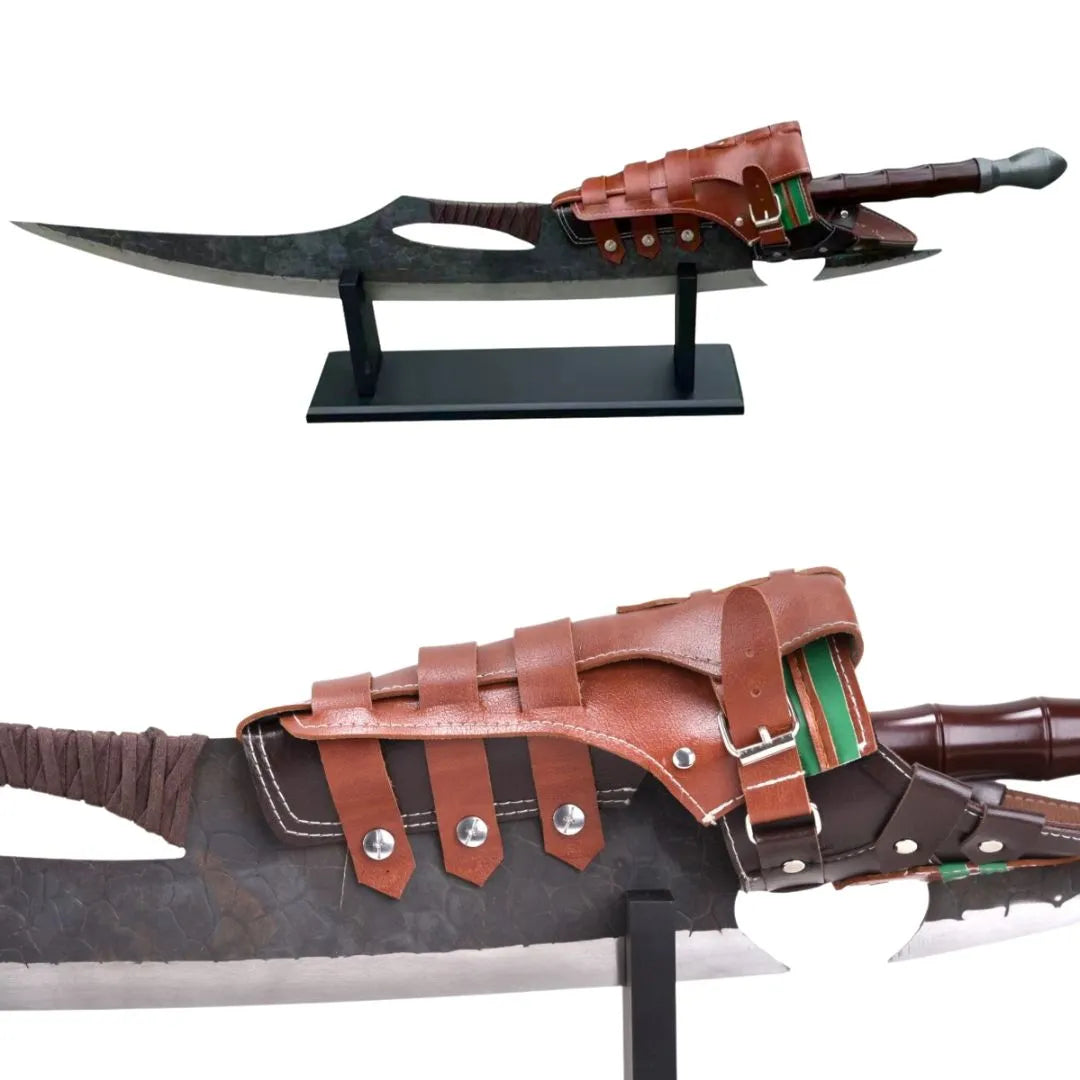 Su mango ergonómico de inspiración tribal y la robusta construcción de la hoja recrean con fidelidad la imponente estética del universo Monster Hunter. Ideal para vitrinas, paredes o como pieza central en una colección épica, esta espada es una oda a la supervivencia en tierras sin ley. Su equilibrado peso aporta presencia sin comprometer la funcionalidad decorativa, permitiendo llevarla o exponerla con elegancia.