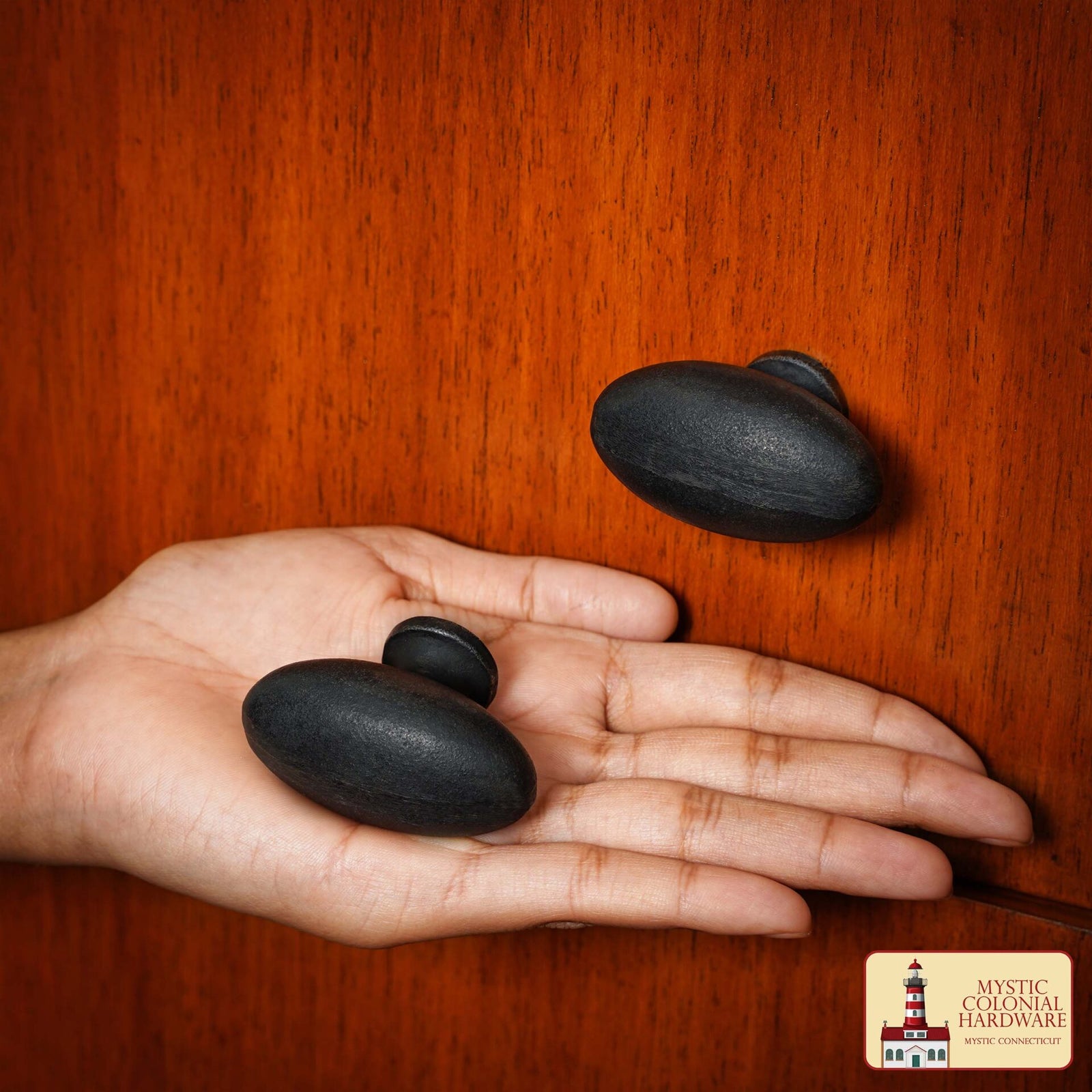 Cada tirador está forjado a mano en hierro de alta calidad, lo que garantiza una resistencia duradera a la vez que conserva las variaciones y texturas naturales que dan a los artículos artesanales su carácter distintivo. El suave diseño ovalado se adapta cómodamente a la mano y aporta una estética refinada y rústica a sus cajones, armarios o cómodas.