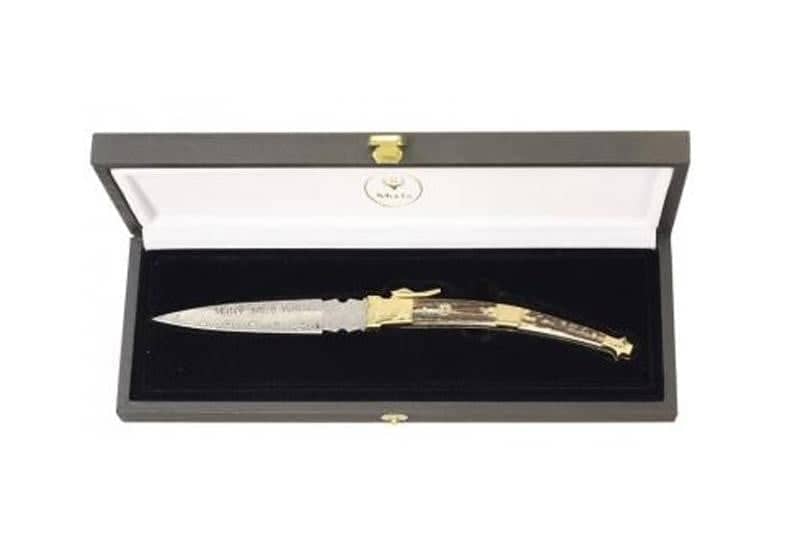 Impresionante navaja de la prestigiosa casa Muela. Es una navaja con hoja de acero de damasco de gran calidad y dureza 57-62 HRC, con cachas asta de ciervo y latón.