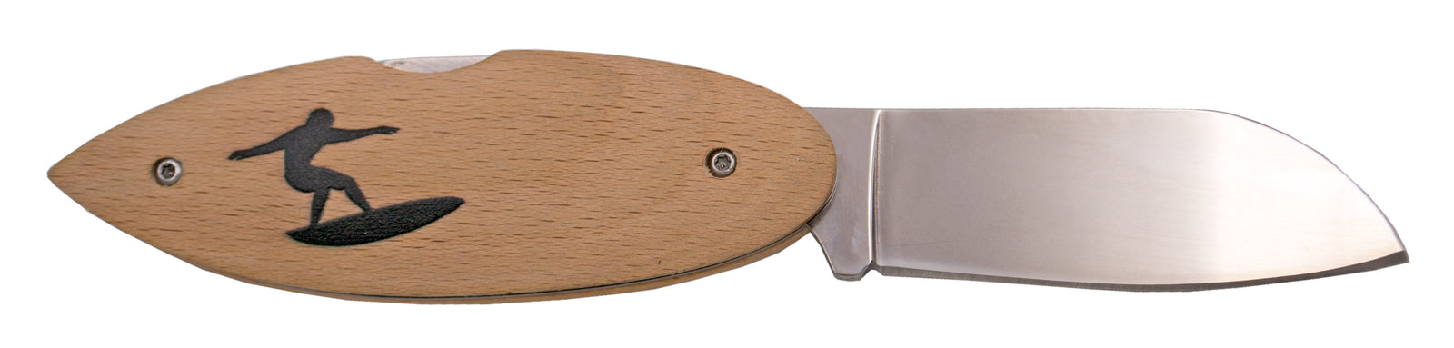 Navaja Third N75S modelo Surf "SURFER" mango de madera de haya con impresión de surfero por dos lados, hoja de acero 420 acabada en brillo espejo de 7,3 cm, navaja de bloqueo trasero. Diseños Propios® Ref. N75S