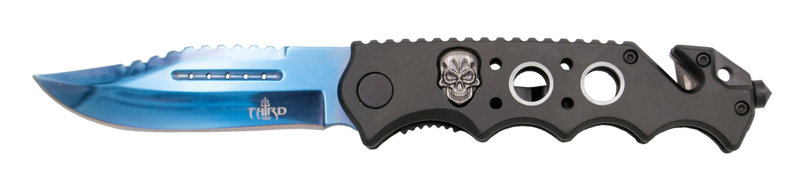 Navaja Third N88A mango de aluminio negro con agujeros y calavera. Hoja de 9 cm bañada en titanio azul. Con clip. Ref. N88A