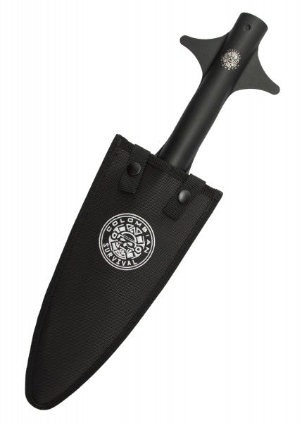 La punta de lanza colosal colombiana es impresionante en sí misma, pero si la montas en un eje de madera, ¡tienes una lanza enorme! La punta de lanza negra recubierta de óxido está hecha de acero al carbono de 3,6 mm de espesor 65Mn con una dureza de 54HRC. Se puede montar en cualquier mango de madera disponible en el comercio con un diámetro de 1 1/8 de pulgada (aprox. 2,85 cm). La enorme punta de lanza de 49 cm de largo viene con una funda de cinturón de nylon con cierre de doble broche.