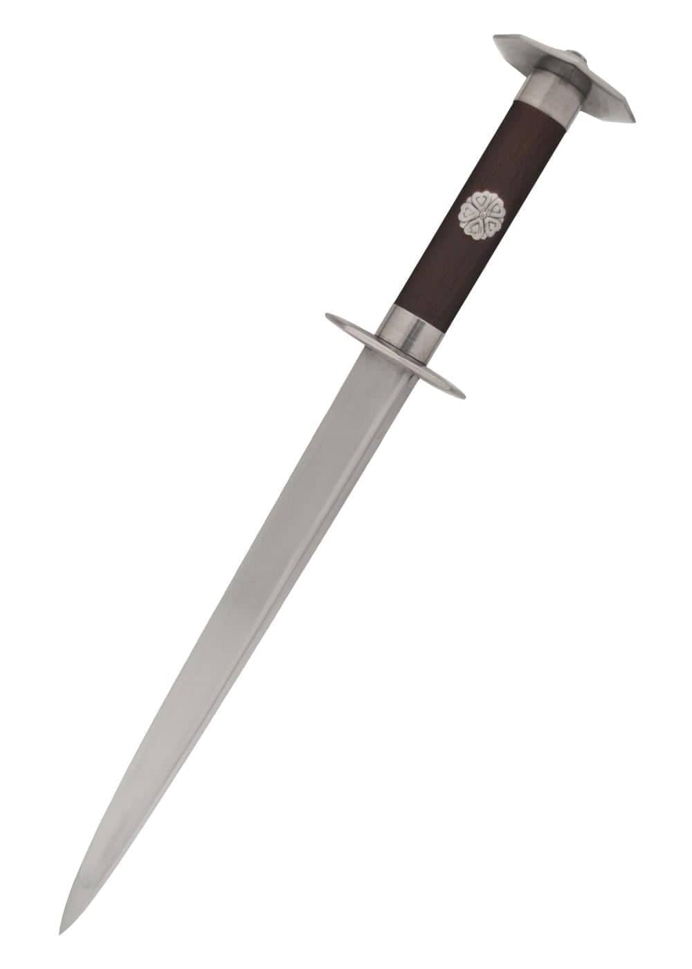 Daga disco es una forma de daga típica de finales de la Edad Media. Durante mucho tiempo, ha sido llevado por amplios sectores de la población, desde simples comerciantes hasta caballeros perfectamente equipados. La hoja de sección en T dura y afilada está forjada en acero al carbono 5160 y tiene un mango de madera dura. Los quillones octogonales, la perilla y todos los accesorios están hechos de acero. Incluye una funda forrada en cuero de madera.