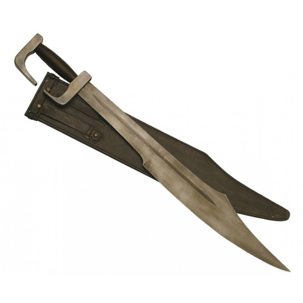 Fabricada en acero al carbono 1095. Forjada a mano y bien templada. Con una hoja de 61 cm con una completa en el centro a lo largo. Espiga completa, fabricada con las piezas de acero sólido tradicionales. Empuñadura de madera con una envoltura de cuero auténtico. Viene equipada con vaina de cuero áspero "desgastado por la batalla? y tahalí. Una hoja malvada que cualquier Espartano hubiera apreciado en la batalla.
