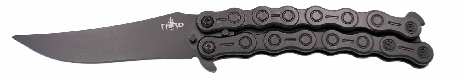 Navaja de abanico de práctica Third K2819BKX hoja de acero 420 de 10.2 cm en negro sin filo, mango con forma de cadena de acero inox acabado en negro. Cierre con muelle. Ref. K2819BKX