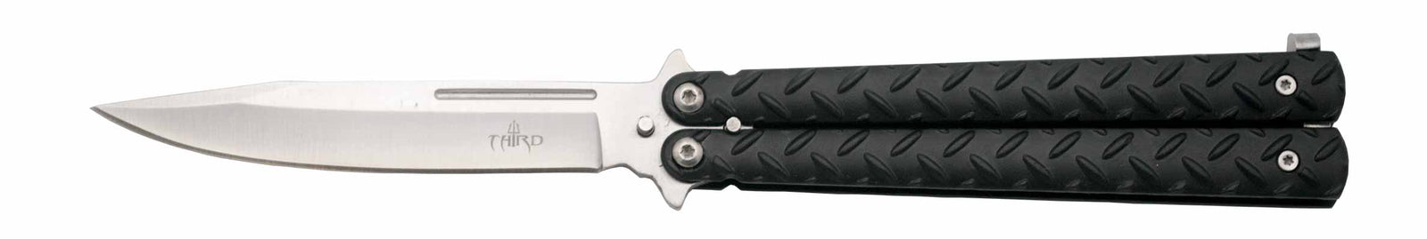 Navaja de abanico Third K2449 hoja de acero inox acabado satinado de 11.5 cm, mango de aluminio negro con relieves. Ref. K2449