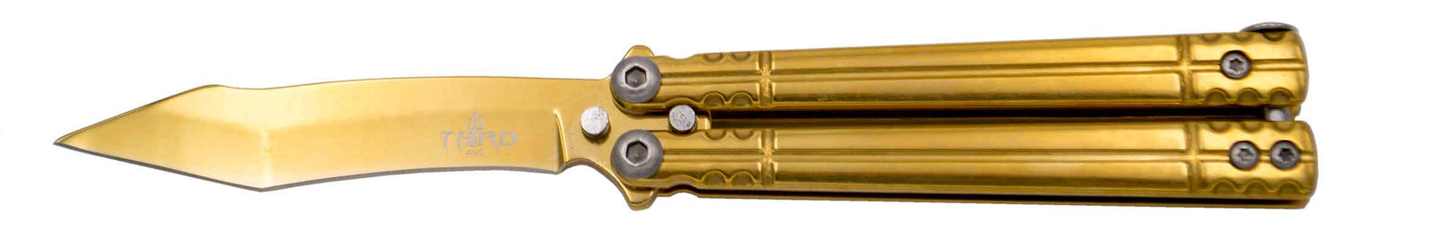Navaja de abanico Third K2820D hoja de acero 420 de 7.2 cm bañado en titanio dorado, mango de acero inox bañado en titanio dorado. Ref. K2820D