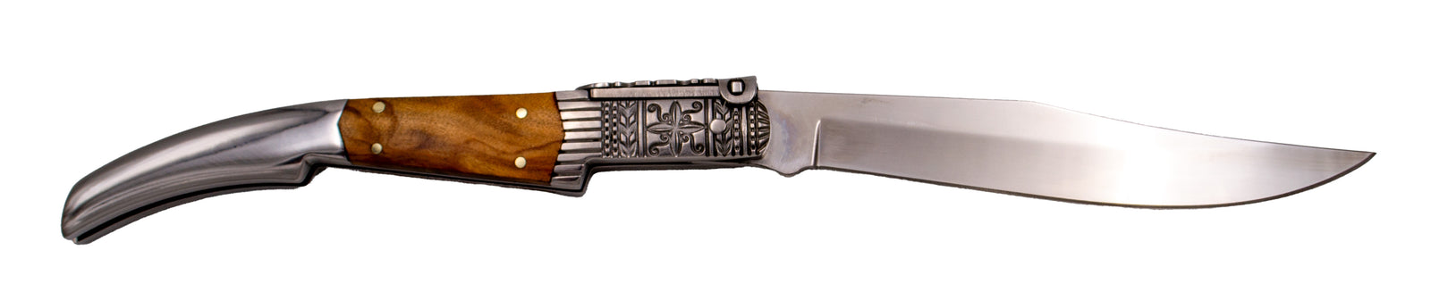 Navaja de carraca de Third Serie Seda Ámbar N50OD, realizadas con tecnología CNC, mango con virolas de acero inoxidable con bajo relieve decorativo basado en navajas clásicas españolas del siglo XIX e inserciones de madera de Olivo, hoja de acero 440 acabada en brillo espejo de 13 cm, con el muelle y la palanquilla decorada. Con caja de presentación. Ref. N50OD
