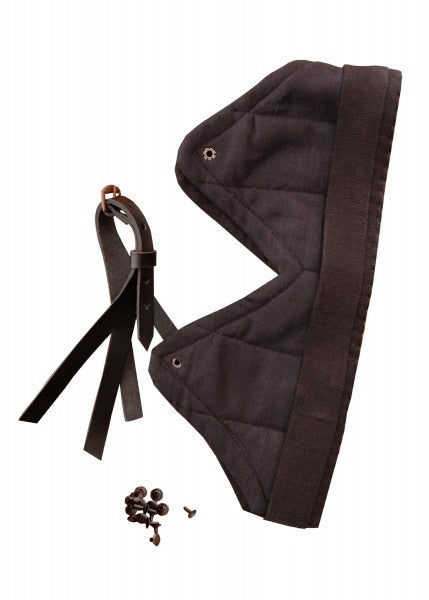 Además de la entrada cosida terminada están incluidos en el alcance de la entrega también la barbilla ya hecha de cuero junto con hebilla de latón, así como remaches y arandelas de acero para su fijación.
