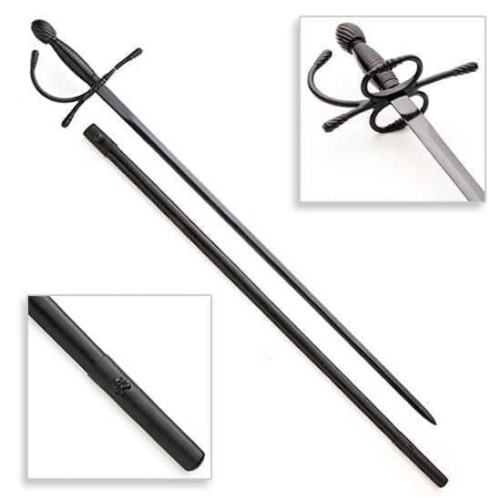 - Empuñadura adornada de acero ennegrecido con pomo de madera cubierta en cuero negro