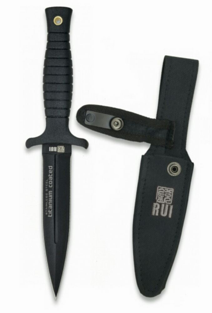 Marca: RUI Tipo: Cuchillo Tctico Botero Mango: Goma Hoja: Acero Inox (Titanium coated) Tamao Hoja: 12.5 cm Tamao Total: 23 cm Grosor: 4 mm Presentacin: Funda nylon RUI