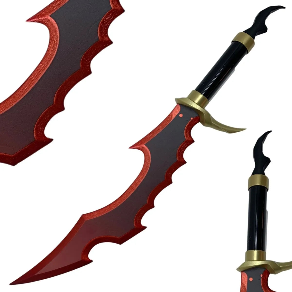 La hoja de bambú presenta un acabado negro con el corte resaltado en rojo, evocando la energía letal del personaje. Se trata de una espada concebida para entrenamiento controlado y recreación temática, manteniendo una presencia visual impactante. Se presenta sin funda y sin soporte.