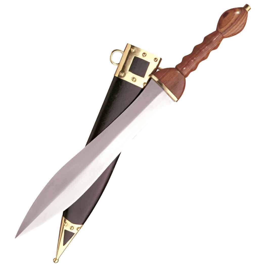Impresionante daga romana llamada Pugio de la colección Windlass de Marto de Toledo. La empuñadura de madera se combina con una hoja de acero al carbono. Viene con una funda de madera cubierta en cuero con piezas de latón. Diseño basado en restos conservados en el Museo Británico. Total: 49 cm Hoja: 31 cm /largo, 5 cm /ancho Peso: 455 gr