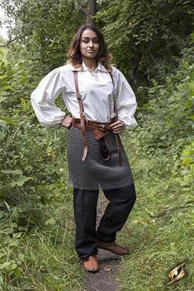 La falda de cadena de Epic Armoury es una falda de armadura de correo flexible hecha de anillos de acero enlazados. El correo cubre la parte inferior del cuerpo desde la cintura hasta los muslos, y está colgado de los hombros por dos fuertes correas de cuero. Cada anillo de acero a topo se entrelaza con otros cuatro anillos en un diseño 4 en 1, y la falda está doblada en cuero para garantizar la comodidad alrededor de la cintura y la ingle.