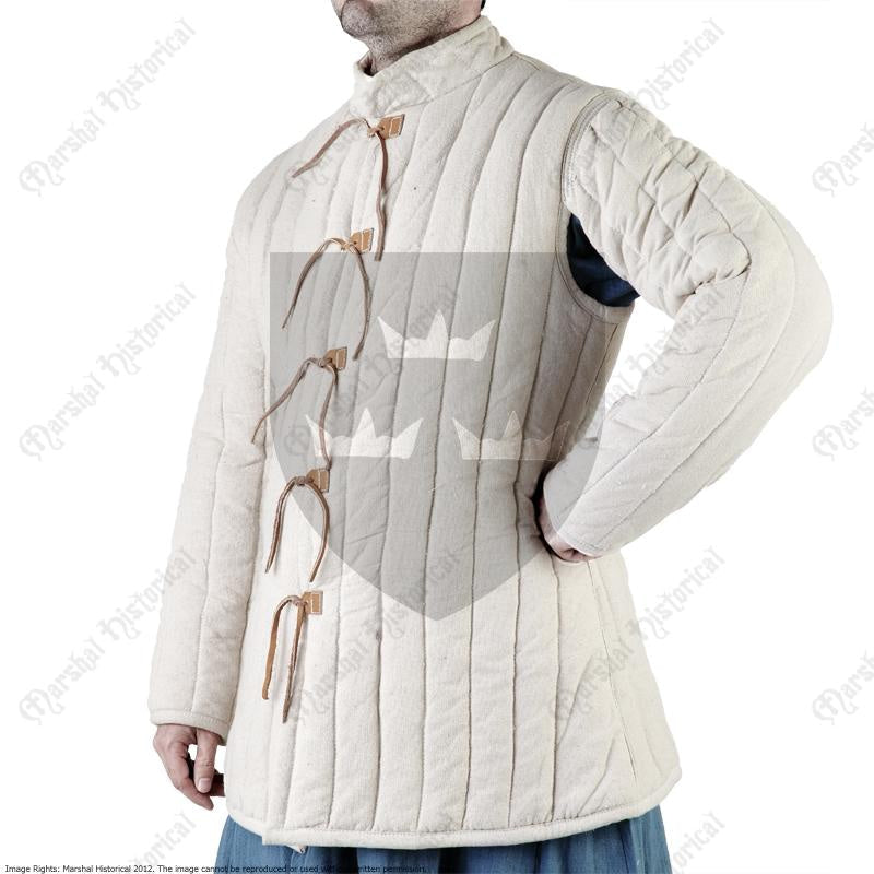 Siempre era posible clavar la punta de un arma a través de los anillos de una cota de malla o cortarla con un buen corte. Esto a menudo hundía profundamente los anillos dañados en la herida. Incluso si el golpe no cortó el correo, el traumatismo contundente por sí solo fue suficiente para romper un hueso o causar daño interno. Una prenda gruesa y acolchada que se usa debajo de una camisa de malla reduce en gran medida el riesgo de este tipo de lesiones y hace que la armadura sea más cómoda de usar. Nuestro gambeson es un tipo usado desde principios de la Edad Media en adelante. Varían mucho en cuanto a grosor, desde una camisa ligeramente acolchada hasta prendas muy rígidas y gruesas.