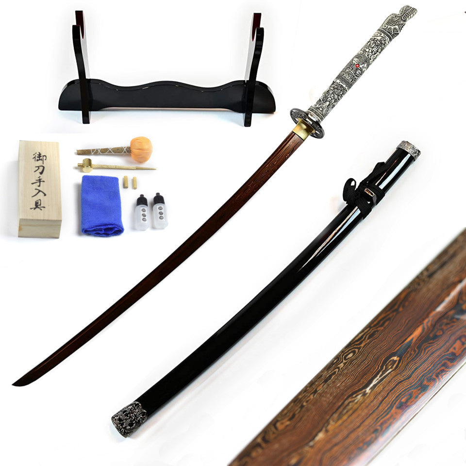 La espada viene con un soporte diseñado especialmente para ella, por lo que puedes exhibirla con orgullo en tu casa o en tu lugar de trabajo. También viene con un set de cuidado para mantener la espada en perfectas condiciones a lo largo del tiempo.
