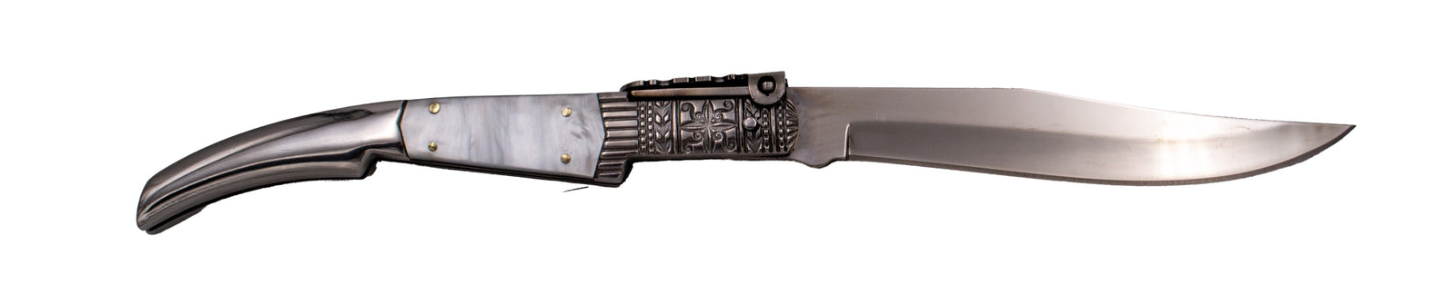 Navaja de carraca de Third Serie Seda Perla N49BD, realizadas con tecnología CNC, mango con virolas de acero inoxidable con bajo relieve decorativo basado en navajas clásicas españolas del siglo XIX e inserciones de acrílico blanco, hoja de acero 440 acabada en brillo espejo de 11 cm, con el muelle y la palanquilla decorada. Con caja de presentación. Ref. N49BD
