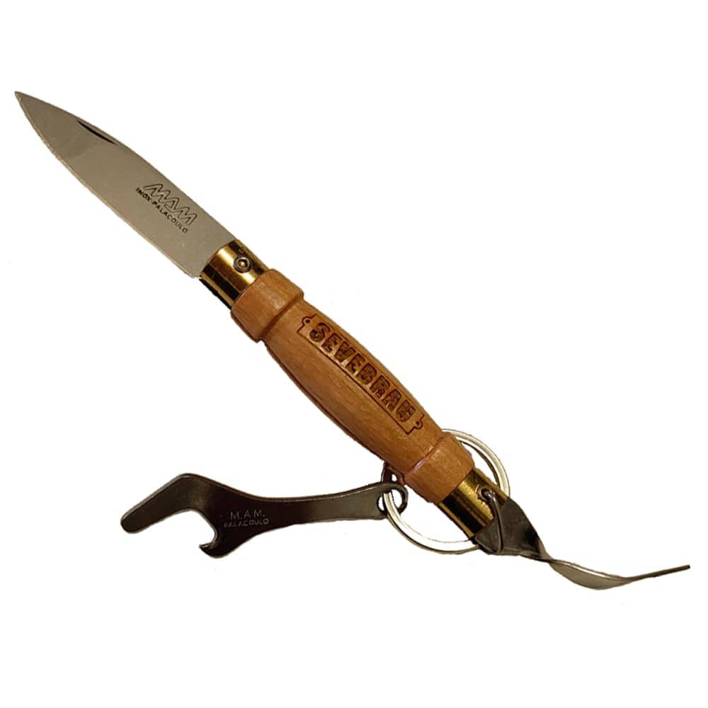 Navaja con tenedor y quita botella. Mango de madera de haya