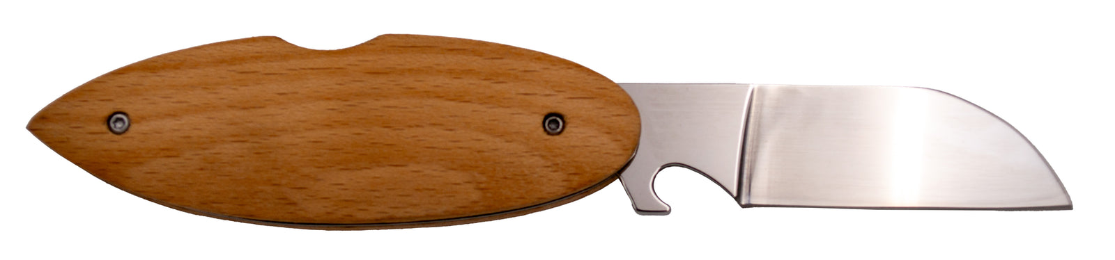 Navaja Third N74 modelo Surf mango de madera de haya, hoja de acero 420 acabada en brillo espejo de 7,3 cm con abrelatas, navaja de bloqueo trasero. Diseños Propios® Ref. N74