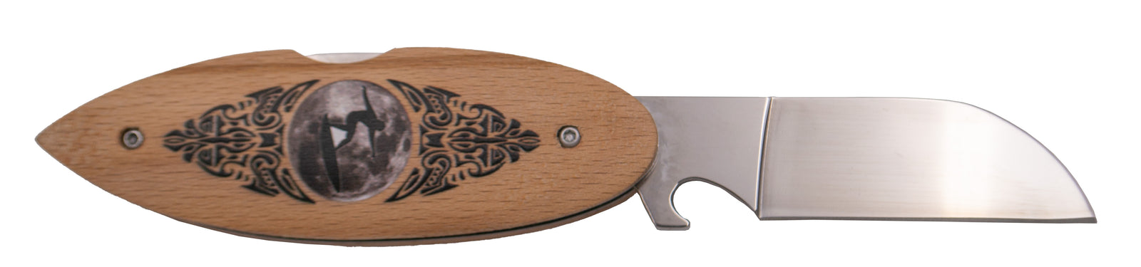 Navaja Third N74M modelo Surf "MAUI" mango de madera de haya con impresión de motivos Mauis por dos lados, hoja de acero 420 acabada en brillo espejo de 7,3 cm con abrelatas, navaja de bloqueo trasero. Diseños Propios® Ref. N74M