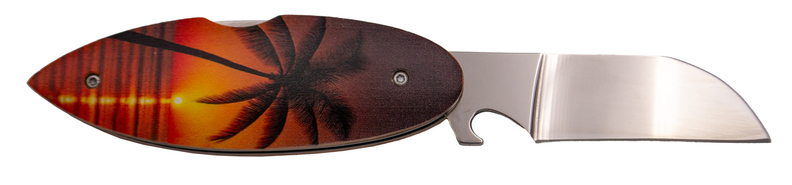 Navaja Third N74P modelo Surf "PALMERA" mango de madera de haya con impresión de palmera por dos lados, hoja de acero 420 acabada en brillo espejo de 7,3 cm con abrelatas, navaja de bloqueo trasero. Diseños Propios® Ref. N74P