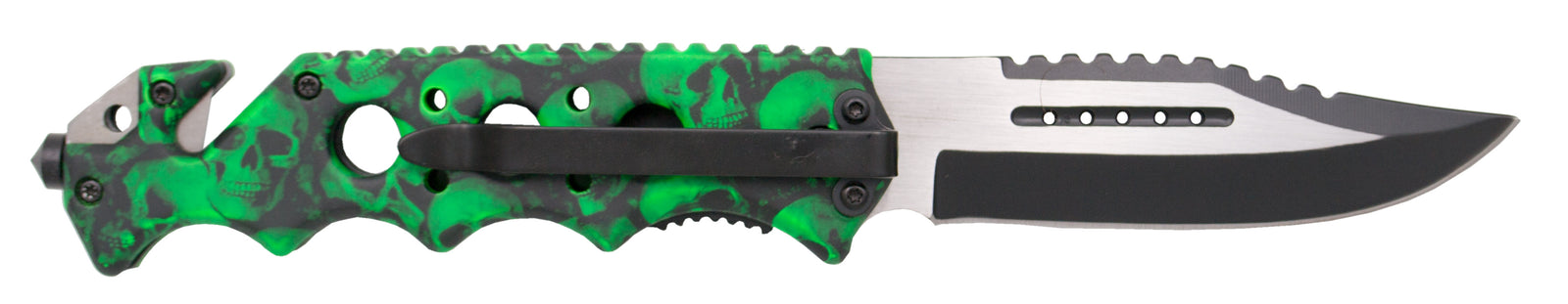 Navaja Third N88V mango de aluminio con recubrimiento camo patrón de calaveras verde, agujeros en el mango y calavera. Hoja de 9 cm satinada con patrón rasgado horizontal, corte y detalles en negro. Con clip. Ref. N88V