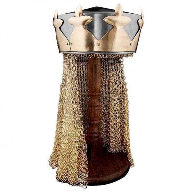 Casco Rey Arturo, hecho de fibra de vidrio liviana y está pintado para tener un acabado de acero antiguo. La corona es de latón pulido y lleva unida una ligera cota de malla de latón.