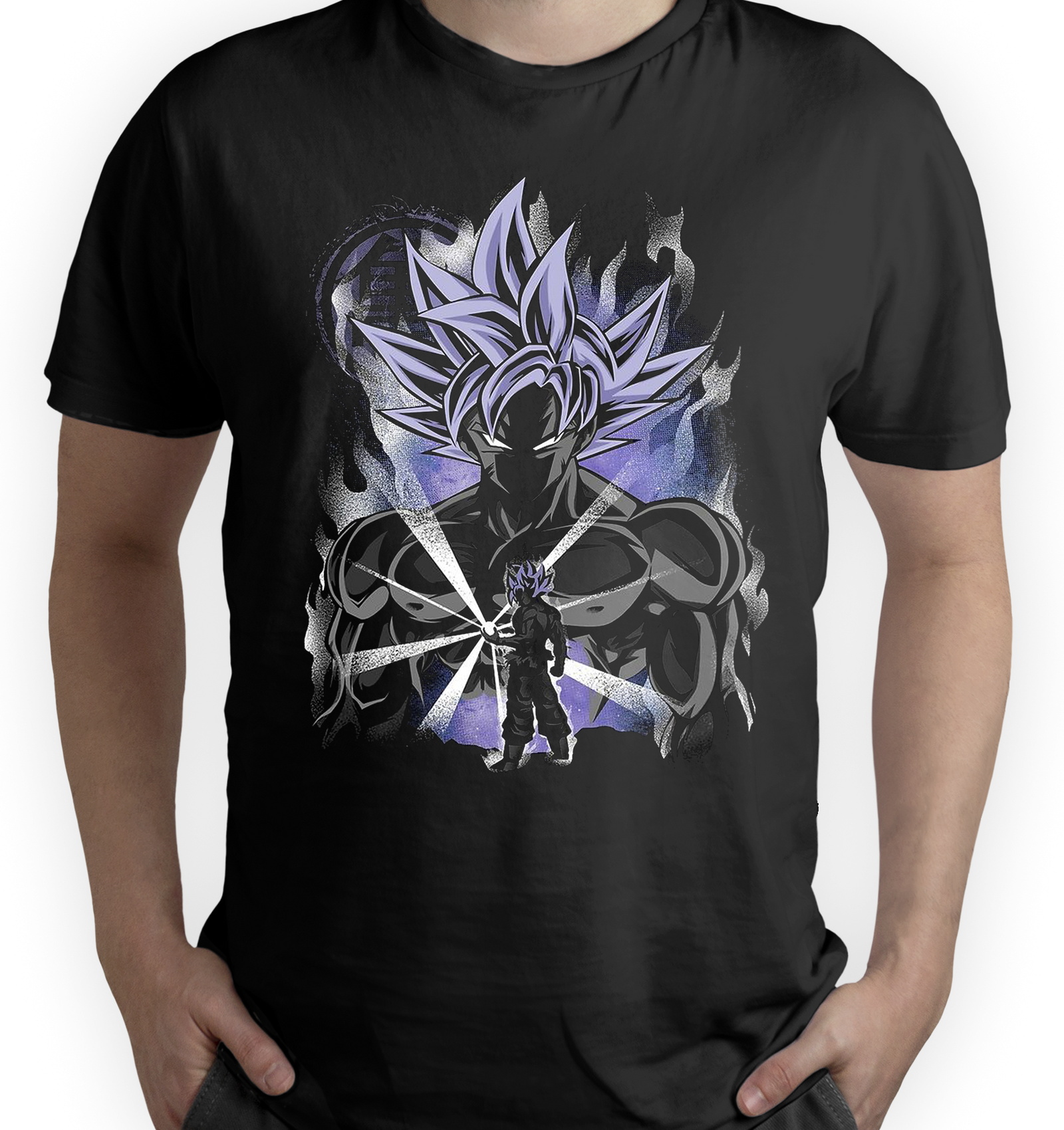 Esta camiseta negra presenta un diseño artístico y complejo de Goku en su estado Ultra Instinto, una de las transformaciones más poderosas vistas en "Dragon Ball Super". El diseño en el frente de la camiseta muestra a Goku centrado, con su cabello característico esculpido en tonos plateados y lilas, simbolizando la culminación de su poder y control. Rodeando a Goku, hay un patrón abstracto y simbólico que se asemeja a un mandala, integrando elementos que parecen círculos y espirales en tonos plateados y grises, lo que añade un aura de misticismo y fuerza sobrenatural.