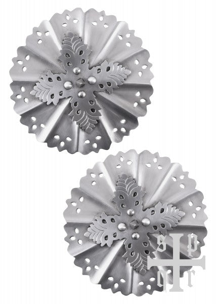 Los discos están hechos de acero de aprox. 1,2 mm de espesor. Están equipados con una correa de cuero en la parte posterior y, por lo tanto, se pueden unir a la armadura de la placa o a una cota de malla. El frente está decorado con hojas forjadas típicas de la época y tiene una espina puntiaguda, porque en ese momento los propios discos también podrían ser útiles como armas.