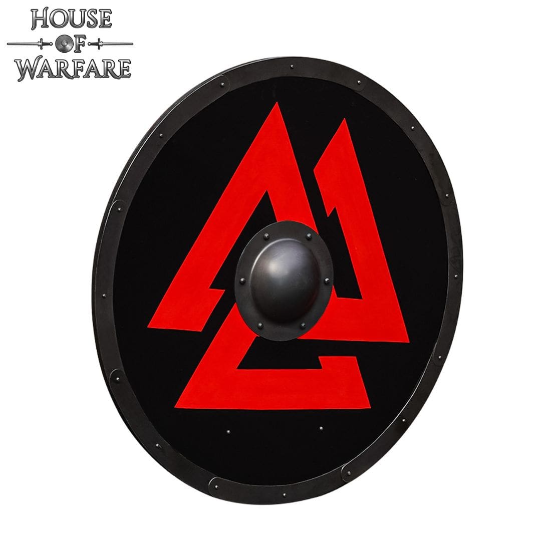 un audaz símbolo de la protección de Odín y el valor de los guerreros. El Valknut, vívidamente pintado en rojo sobre un fondo negro, representaba el valor, el sacrificio y la promesa de gloria eterna en el Valhalla para aquellos que cayeran noblemente en la batalla. Los vikingos llevaban esta marca de Odín como tributo a su herencia, emblema espiritual y declaración de lealtad a los dioses.