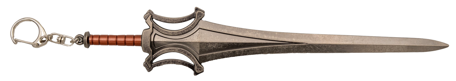 Fabricada en zinc y acero, esta espada destaca por su construcción sólida a pequeña escala y por incorporar un sistema de apertura que añade un componente mecánico y visual atractivo. Se presenta servida en blister e incluye soporte, facilitando su colocación como objeto decorativo en vitrinas, escritorios o colecciones temáticas.