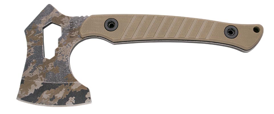 Hacha Third S4000TN de acero 420 con patrón de camuflaje de 20.5 cm total, mango de G10 camel. Con funda de nylon. Ref. S4000TN