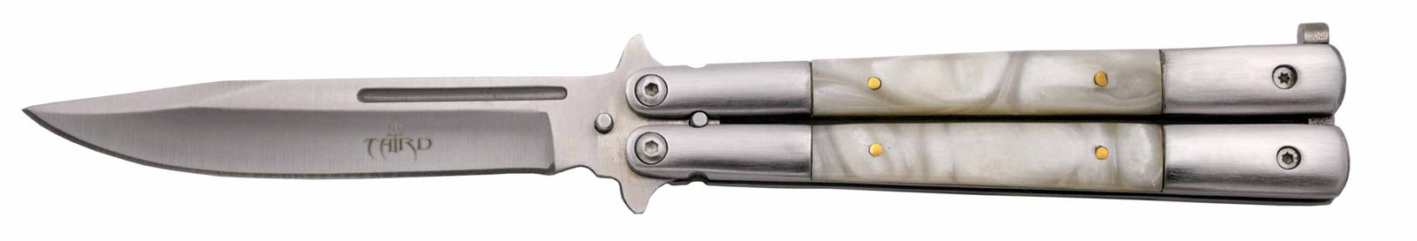 Navaja de abanico Third K2097 hoja de acero inox acabado satinado de 11.5 cm, mango de acero inox y metacrilato imitación nacarina. Ref. K2097