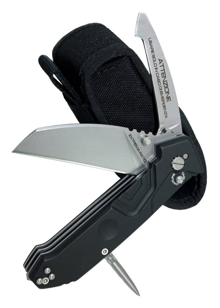 La herramienta consta de una cuchilla estándar con una forma de cuchilla cuadrada especial, la cuchilla de rescate / cortador de cinturón con apertura automática, una punta de aguja, un rompe cristales en el extremo del mango, un clip convertible para cinturón y la funda Cordura.