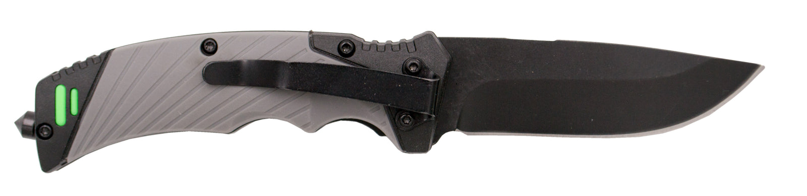 Navaja Táctica Third modelo N77 hoja de acero 420 acabado negro de 7,5 cm, mango de ABS negro con inserción de goma gris. Contiene pedernal para hacer fuego, silbato y rompecristales. Ref. N77