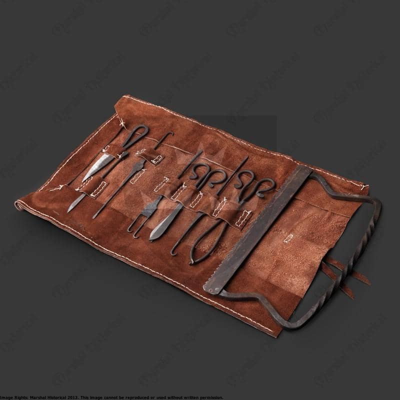 Set formado por 8 piezas de acero forjado entre las que incluye: forceps, escalpelo, tijeras, cuchillo y sierra de hueso.
