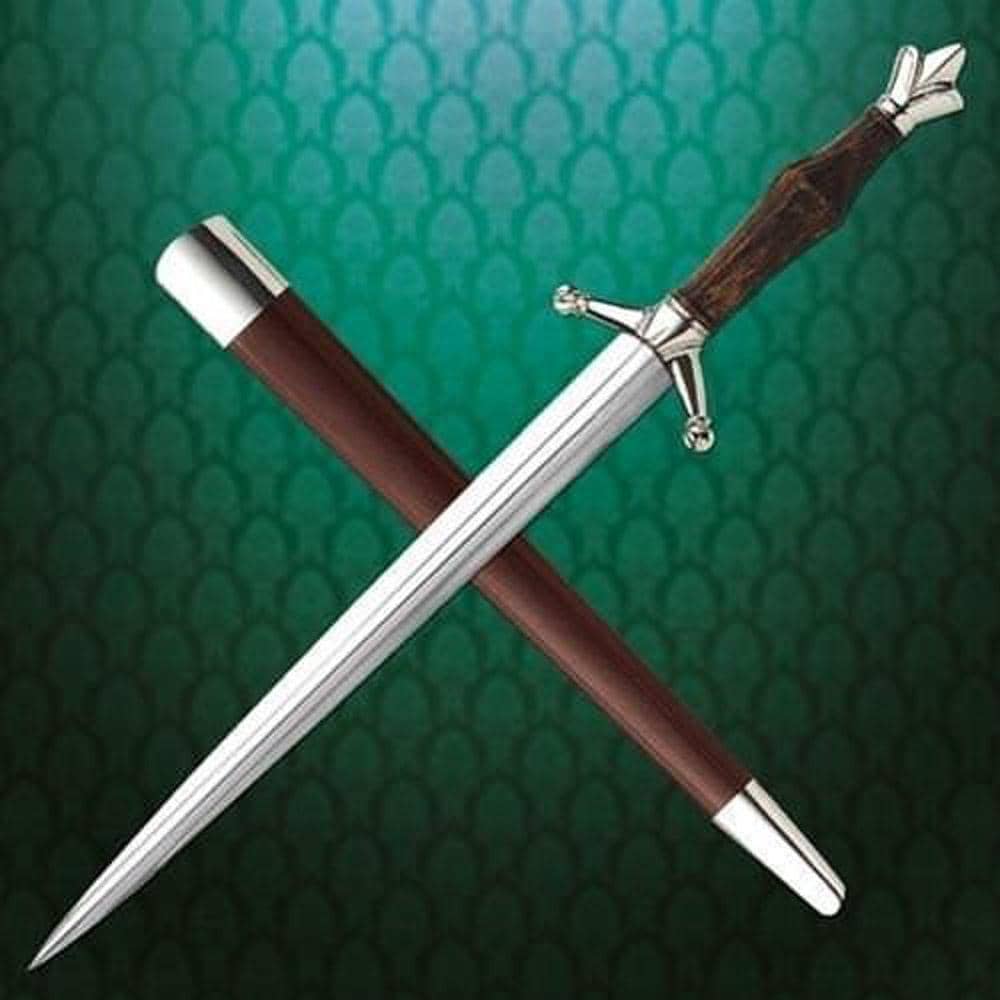El diseño de esta Daga Real, presenta un pomo en forma de una cola de pez tan popular durante los siglos XIV y XV. La floritura del pomo y las quillas en forma de estrella proporcionaban una presencia real que realzó esta función rápida de las dagas. La hoja elegantemente larga tiene una gruesa espina pesada para dar fuerza, favoreciendo un empuje poderoso. El pomo le da un excelente equilibrio, mientras que el mango contorneado en madera dura le proporciona un aspecto sólido