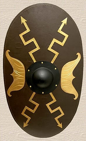 Este escudo ovalado de madera, muy utilizado por la caballería romana, está cubierto de cuero por ambas caras. Tiene en el centro un resalte de acero negro adornado con alas de cuero dorado y relámpagos en la cara curva y en las correas para los brazos en la parte posterior. ¡Imprescindible para completar tu atuendo romano!