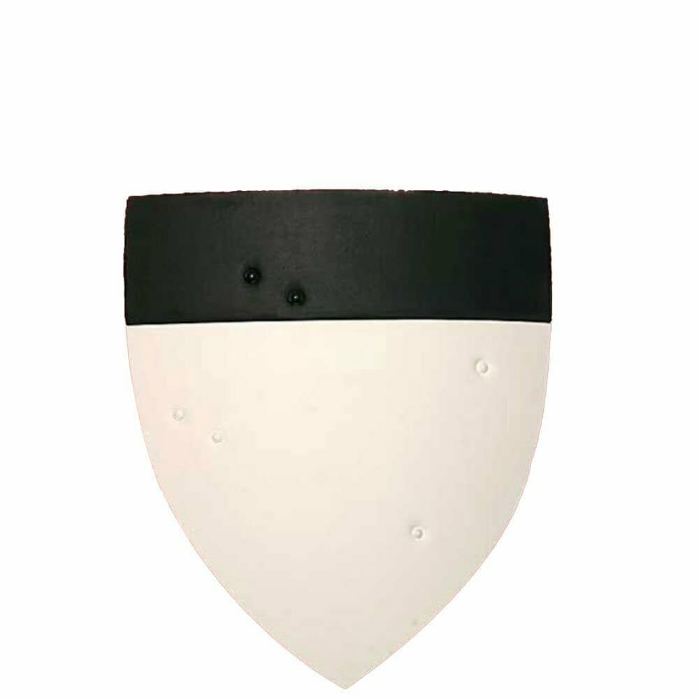 Este escudo de alta calidad está hecho de madera curvada y está muy acolchado con un lienzo duradero. El escudo blanco y negro tiene, por la parte posterior, correas ajustables y protector acolchado para el brazo.