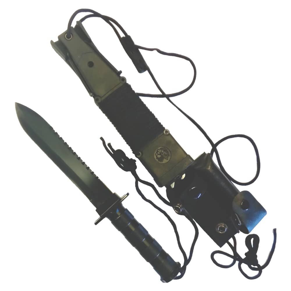 La funda está equipada con un paracord de emergencia adicional, tirachinas de goma, desollador de acero profesional, espejo y piedra de afilar.